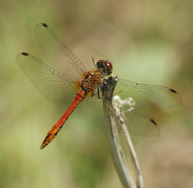Dies ist eine Männchen der Blutroten Heidelibelle, das noch nicht ganz ausgefärbt ist.